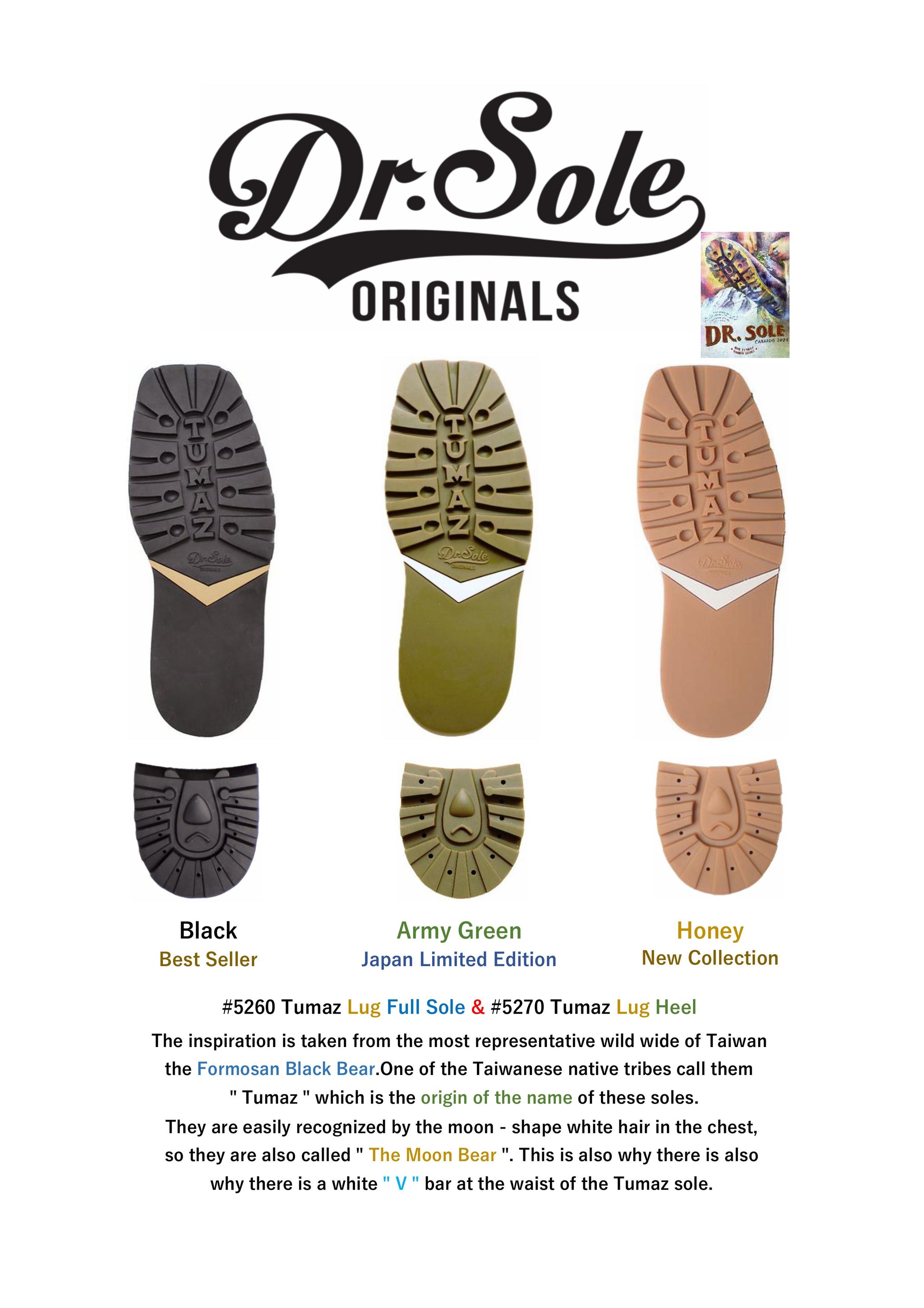 Dr. Sole's very first lug soles - Tumaz. The inspiration is taken from the most representative wildlife of Taiwan - the Formosan Black Bear. One of the Taiwanese native tribes call them “Tumaz,” which is the origin of the name of these soles.