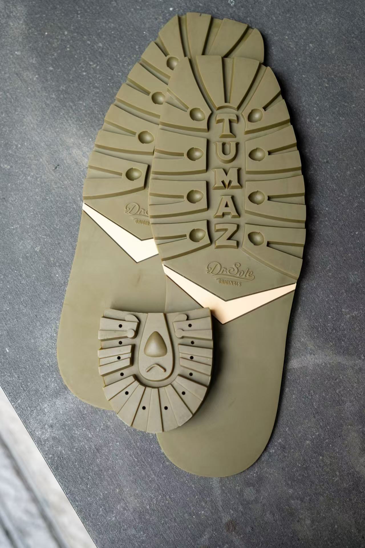 Dr. Sole's very first lug soles - Tumaz. Those are heels of them. The inspiration is taken from the most representative wildlife of Taiwan - the Formosan Black Bear. One of the Taiwanese native tribes call them “Tumaz,” which is the origin of the name of these soles.